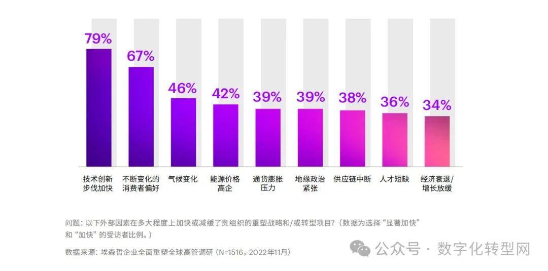 同时,转型所面临的挑战更多元,企业需巧妙应对多方因素挤压,转型难度显著提升。冲击企业转型决策制定与行动部署的压力来自外部的多个方面。埃森哲全球企业高管调研显示,科技创新的加速迭代、消费者需求的不断变化、气候变化、供应链挑战、人才短缺等因素,均在较大程度上推动企业加速重塑(见图3)。面对外部的高颠覆性,企业已经进入“挤压式转型”阶段。如何短时间内快速反应、化多方压力为多元机遇,成为了全球企业亟待厘清的难题。