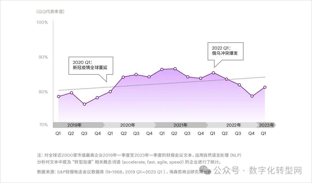 全球企业正面临“挤压式转型”的挑战。从时间维度上进行观察,近年来,“转型加速”已经成为了全球企业讨论的重要议题。基于对全球近2000家市值最高企业的财报会议进行的自然语言处理(NLP)分析,埃森哲研究发现,自2019年一季度至2023年一季度,约八成企业提到转型加速这一概念,这一趋势在发生外部不确定事件时更为凸显:新冠疫情开始全球蔓延的2020年一季度,以及俄乌冲突爆发的2022年一季度,在财报会议中提及转型加速的企业比例均有攀升(见图2)。