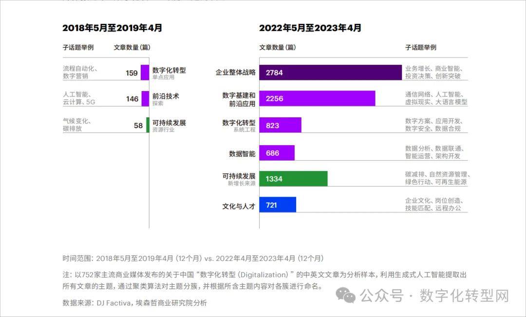 与外界环境的变化相适应,中国企业的数字化转型内涵也在不断演进和丰富。企业对数字化转型的思考,已经从单一的技术视角扩展到更多维度。基于752家主流媒体发布的关于中国“数字化转型”的中英文报道,埃森哲通过将生成式人工智能(Generative AI)与人工聚簇相结合发现,2019年到2023年间,关于中国企业数字化转型的文章增长了12倍,数字化转型的讨论热度显著提升。同时,讨论主题也持续演进,数字化转型在深度、广度上有了新要求(见图5)。