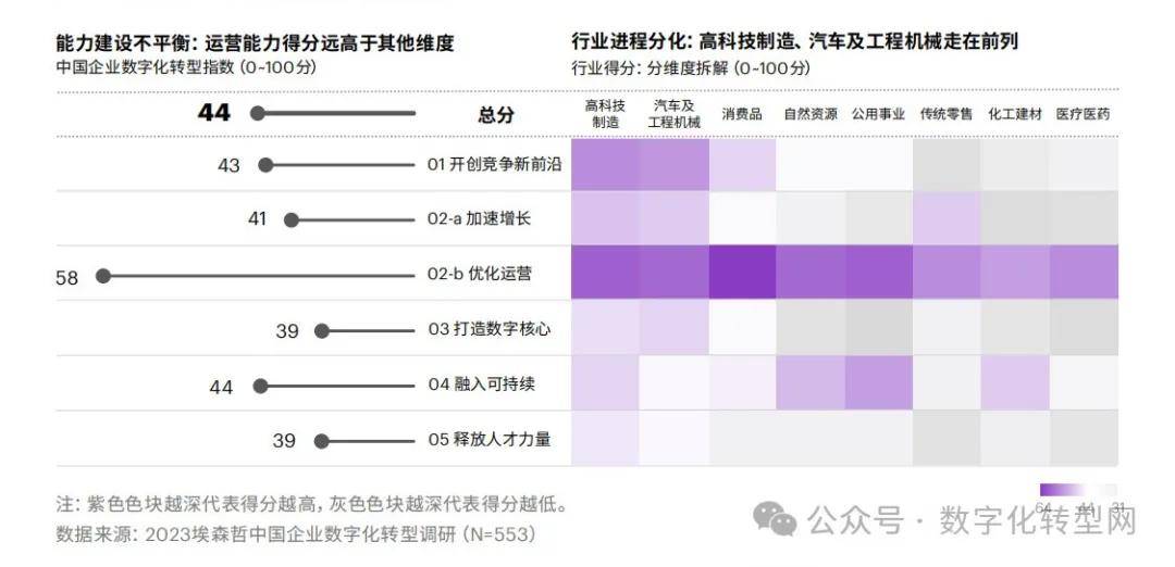 从行业得分来看,同全样本一致,各行业在优化运营维度的表现亮眼,但在重塑的关键能力上有所分化。整体来看,高科技制造、汽车及工程机械行业走在前列,除了运营维度,这两个行业在开创竞争新前沿也表现突出。究其原因,其数字化成熟度一直相对较高,数字化转型基础稳固,行业企业将技术作为应对行业格局和外部不确定的核心竞争力,除了深化数字技术与主营业务的规模化融合,还积极培育和储备人工智能、大数据、云计算等技术,寻求业务边界新突破。